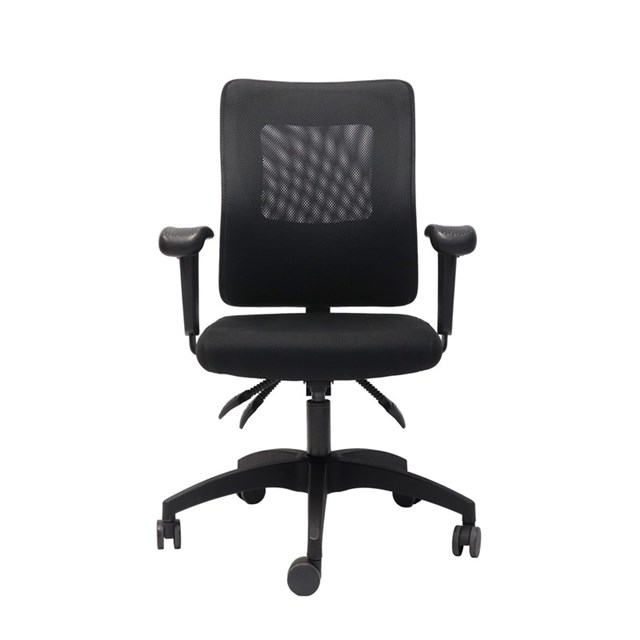 Medium Back Mesh Operator Chair in Black Fabric 3 Lever Fully Ergonomic Mechanism Gas Lift, Seat Pan and Back Rest Tilt 120kg Weight Rating Black 5 Star Base on Castors Black Mesh Back Rest with Black Upholstered Seat Pan 5 Year Warranty