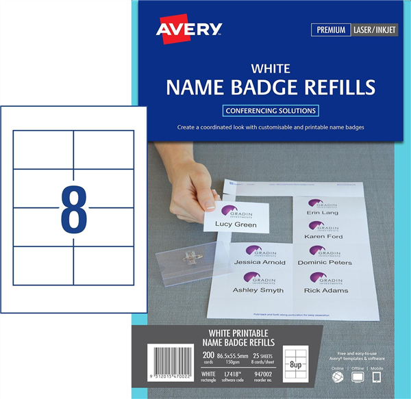 • Simply design, print and insert into your existing Avery Name Badge Holders as refills to save on the cost of purchasing new holders every time you hold a new event