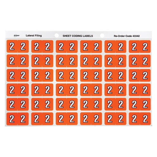 • There are 180 orange Numeric 2 Side Tab Colour Coding Labels in a pack with a size of 25 x 38mm ready to stick straight onto the side tab of your Avery Lateral Files.