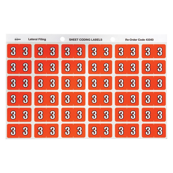 • There are 180 dark orange Numeric 3 Side Tab Colour Coding Labels in a pack with a size of 25 x 38mm ready to stick straight onto the side tab of your Avery Lateral Files.