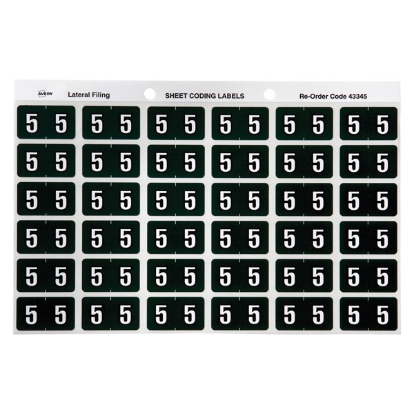 • There are 180 dark green Numeric 5 Side Tab Colour Coding Labels in a pack with a size of 25 x 38mm ready to stick straight onto the side tab of your Avery Lateral Files.