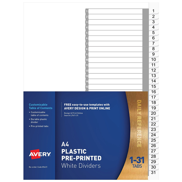 Avery Dividers Pre Printed 1 to 31 Tabs White Set Adelaide Direct Stationers