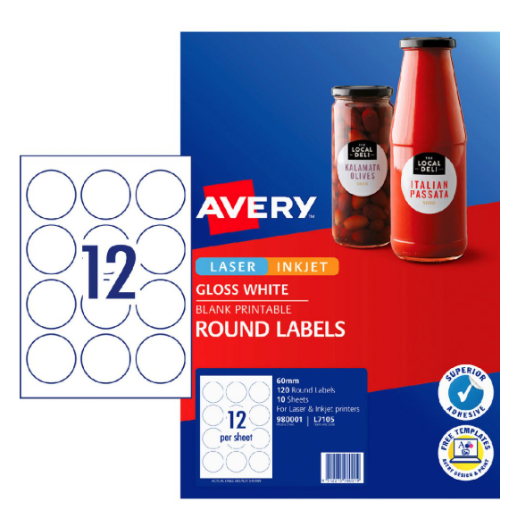 Avery L7105 Labels Glossy Round 12UP White 10 Pack Adelaide Direct Stationers