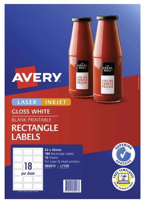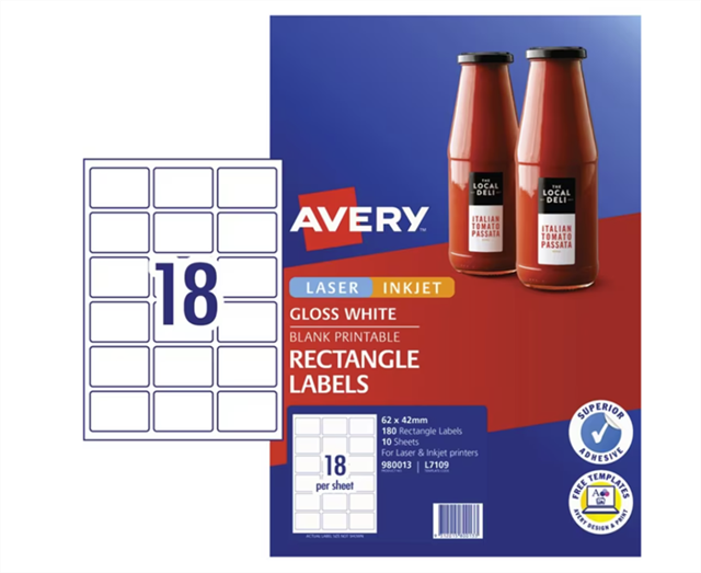 Avery L7109 Gloss White 18Up Labels 62*42mm Pk10 (This product is sold on a non-return basis only. Refer to our returns policy) Adelaide Direct Stationers