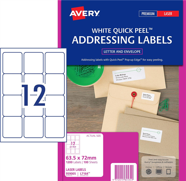 • The label format is 63.5 x 72mm with 12 labels per sheet and is an ideal size for applying to DL envelopes