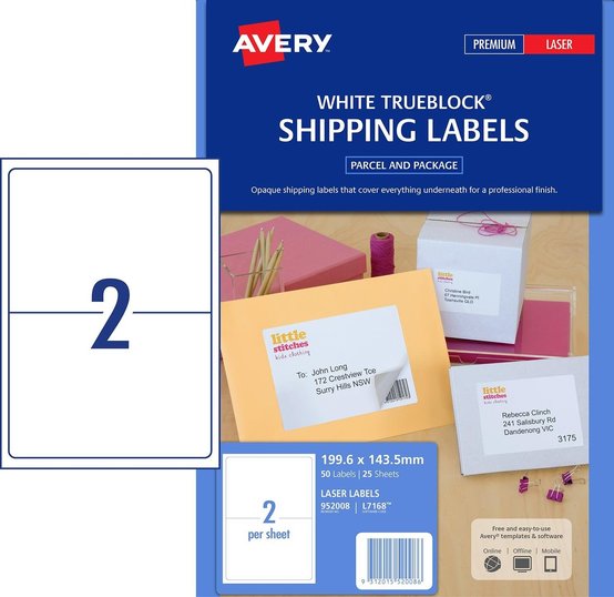 Avery L7168 Labels Shipping 2UP White 25 Pack Adelaide Direct Stationers