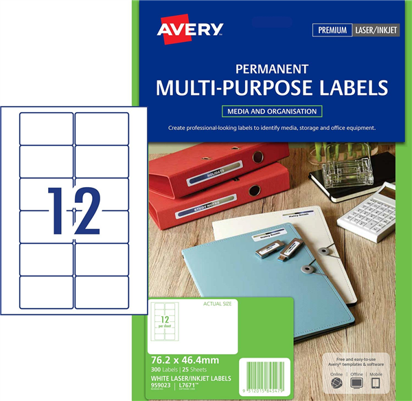 • Avery Permanent Multi purpose Labels are designed for many different uses around the home or office and come in a range of sizes to suit your labelling needs.