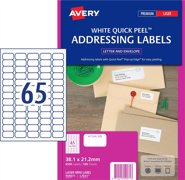 • The label format is 38.1 x 21.2mm with 65 labels per sheet and is an ideal size for return address labels.