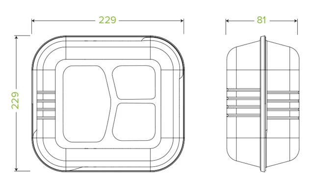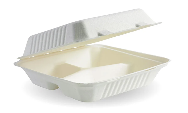 • Our 9x9x3" 3-compartment white bagasse clamshell containers are an eco-friendly alternative to plastic takeaway containers.