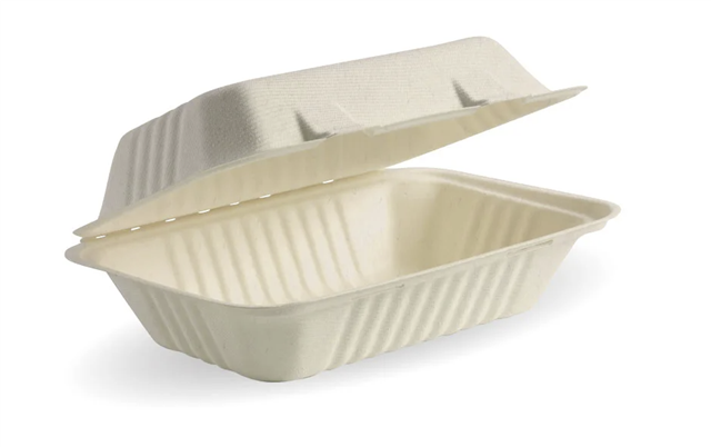 • Our 9x6x3" natural bagasse clamshell containers are an eco-friendly alternative to plastic takeaway containers.