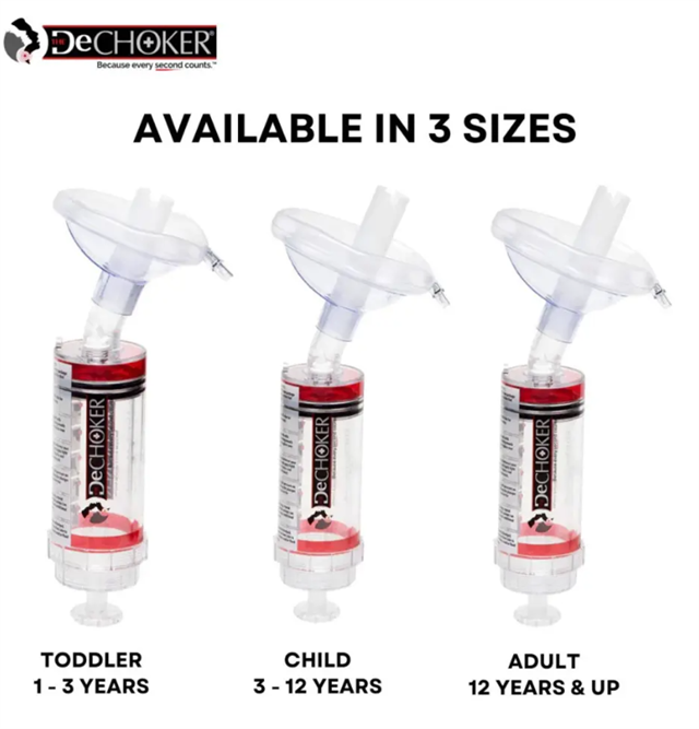 The Dechoker is available in three sizes: Toddler (1-3 years), Child (3-12 years), and Adult (12 years and up), ensuring suitability for a wide range of users