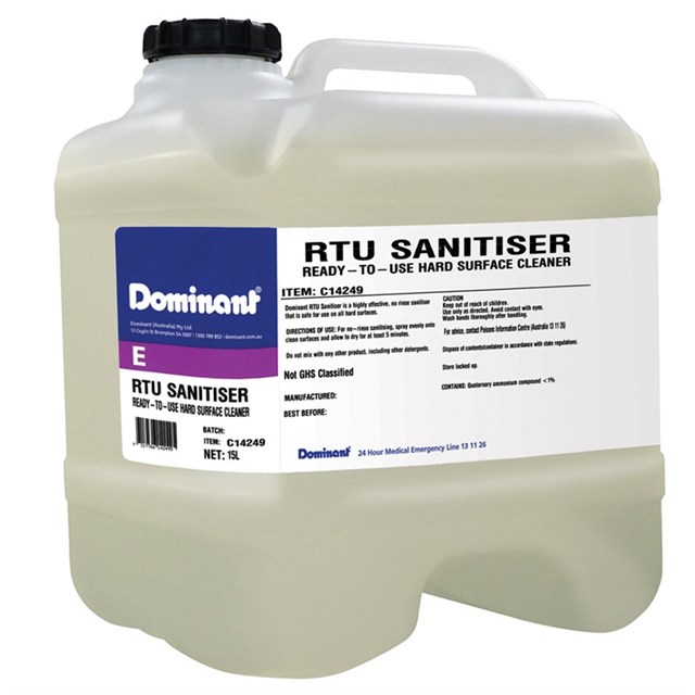 Dominant RTU Hard Surface Cleaner No-Rinse Sanitiser Drum 15L Adelaide Direct Stationers