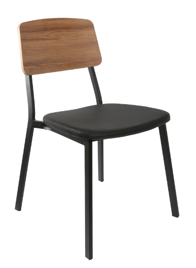 • What sets the Denver Chair apart is its customizable features: a sleek black vinyl seat pad and the option of either vinyl or veneered plywood for the backrest, allowing for tailored configurations to suit individual preferences and interior themes