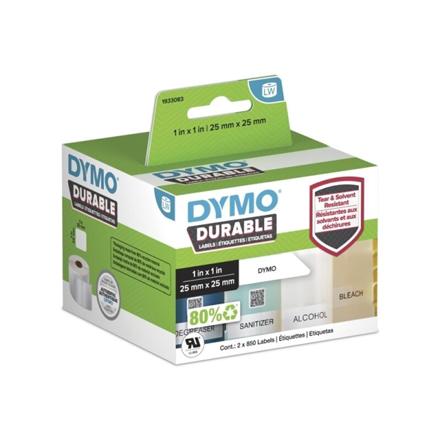 Dymo LabelWriter Durable Multi Purpose Labels 25mm x 25mm feature industrial-strength adhesive and a rugged coating that resists peeling and abrasion caused by moisture and solvents