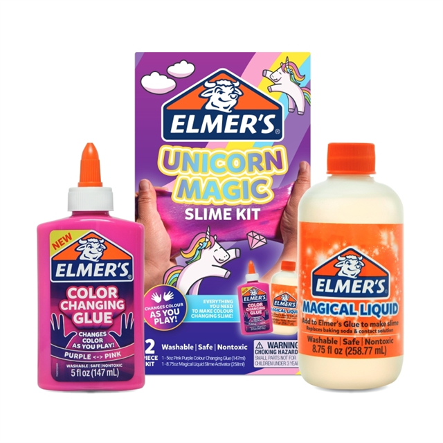 Elmers Unicorn Magic Slime Kit Bx4 contains everything you need to make colour-changing slime! Kit includes: 1 bottle of Elmer's Magical Liquid Slime Activator (258ml) 1 bottle of Pink Purple Colour Changing Glue (147 ml)