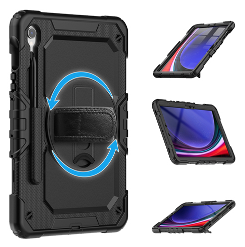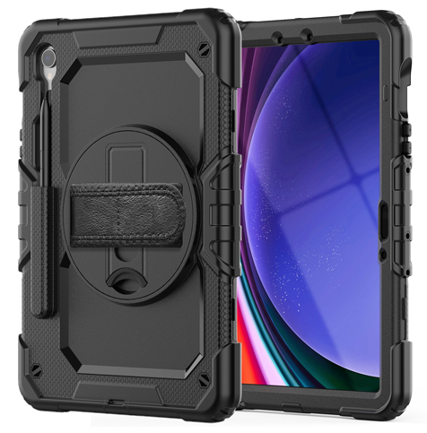 Inner hard plastic layer and outer soft layer that combine to form a strong protective barrier against scratches, bumps and dust Reliable, firm grip Crafted to tightly encapsulate the Samsung Galaxy Tab S9 FE's contours for an optimal fit Full access to all controls, sockets, the camera Specially designed flaps to protect sockets from dust and damage when not in use Rotating kickstand and handle that holds up your device when in use Built-in HD screen protector that protects your screen from dust and scratches Built-in stylus holder