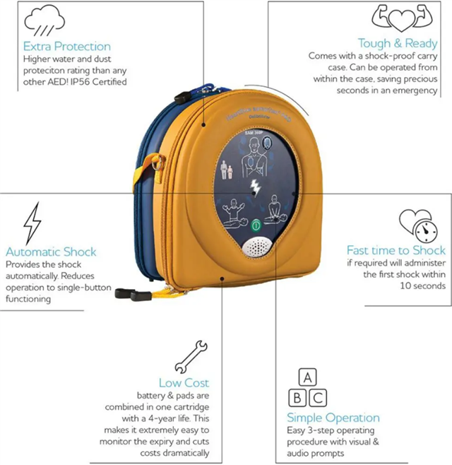 • The SAM 360P is a fully automatic defibrillator designed to analyse heart rhythm and automatically deliver an electrical shock (if needed)