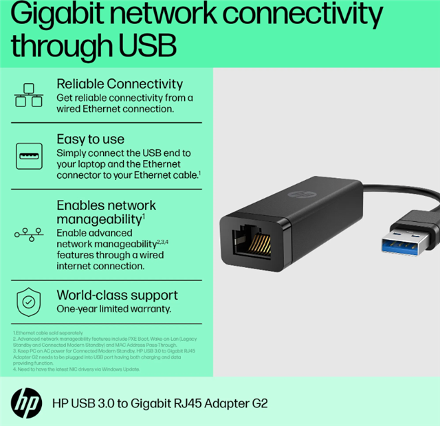 The HP USB to Gigabit RJ45 Adapter enables seamless wired network access through a USB port, providing stable and fast Gigabit Ethernet connectivity