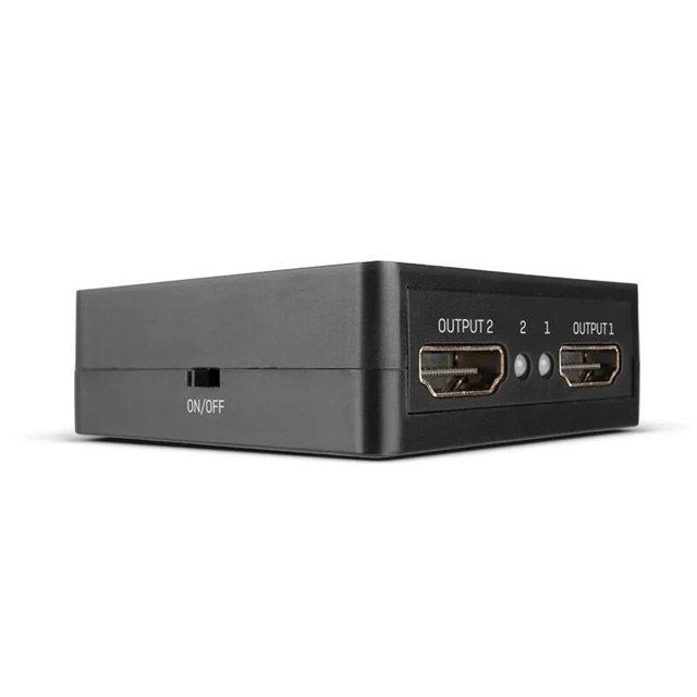 A compact, USB-powered HDMI 2.0 splitter that connects a single source to two 4K Ultra HD displays simultaneously, supporting 4K@60Hz, HDR, and HDCP 2.2.