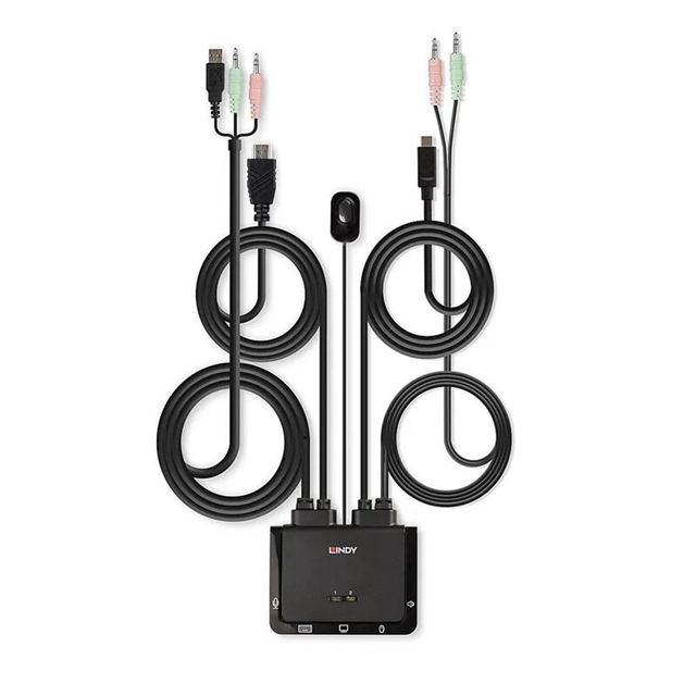 The Lindy 2 Port KVM Switch is a bus-powered desktop solution designed to share one keyboard, one mouse, and one monitor between two computers: one connected via HDMI and the second via a versatile USB Type-C port (supporting DisplayPort Alternate Mode)