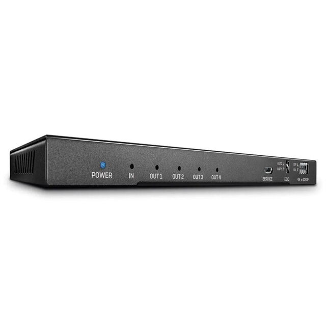 • It features 4 HDMI Type A Female outputs for display replication and an integrated Audio De-Embedder with separate Toslink (Optical) and 3.5mm stereo outputs for connecting to non-HDMI audio systems