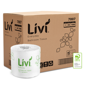 The Livi Basics 7007 toilet paper roll is made from 100% virgin grade fibre and sold in 48 roll cartons for easy wholesale shipping