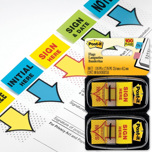 Post It Message Flags with Sign Here in Yellow and 1 in wide size are easily read on both the left and right hand side of the page.