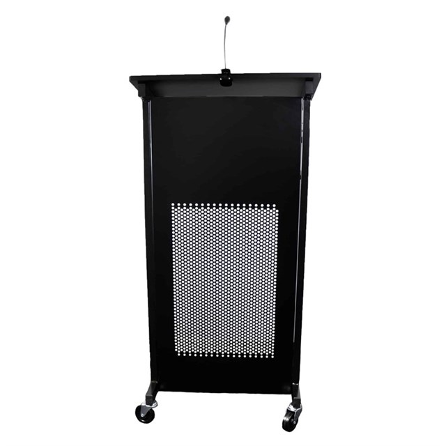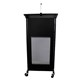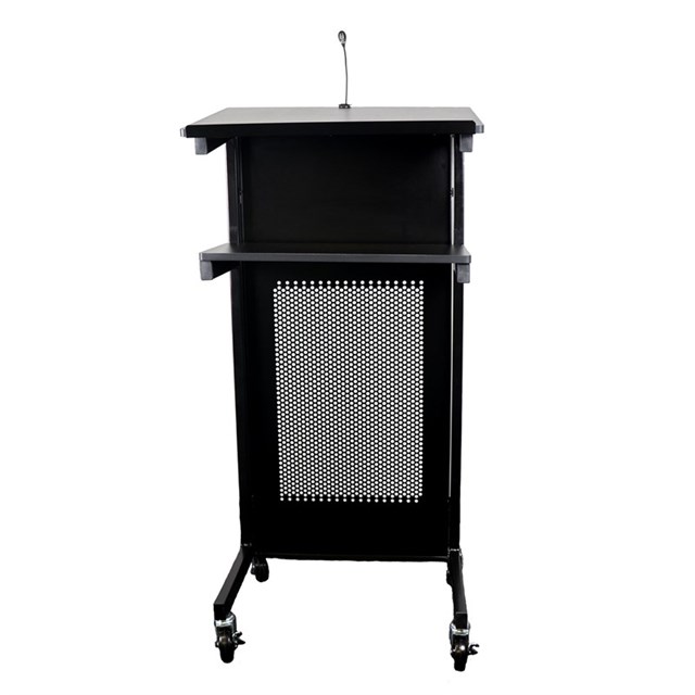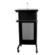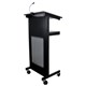 Rapidline Heavy Duty Lectern 1200mm H x 445mm W x 450mm D Black P/C Finished Steel Frame 15mm T Black Melamine Shelves Detachable Adjustable Battery Powered LED Light Angled Top Shelf For East Reading On Presentations Second Shelf For Storage Of Notes Easy Self Assembly Top Shelf Dimensions: 600mm W x 400mm D Second Shelf Dimensions: 550mm W x 260mm D Heavy Duty Lockable Castors 8 Year Warranty