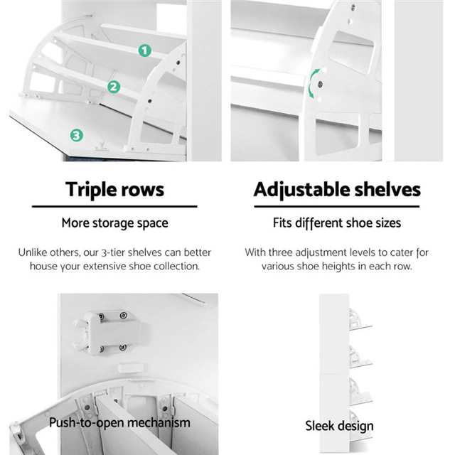 • Made of thick particle board with melamine finish, the shoe cabinet is strong and durable to withstand daily robust use