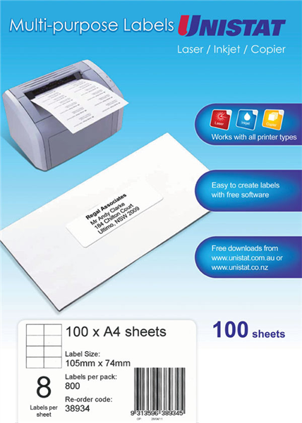 Unistat Multi Use 8UP Labels 100 Box Adelaide Direct Stationers